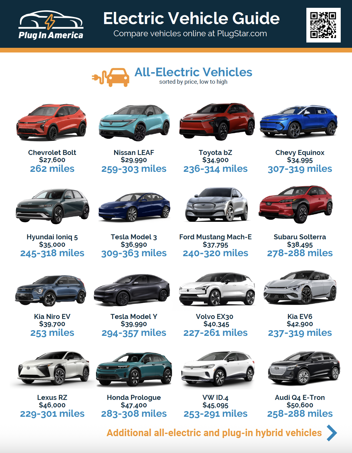 Plug In America’s Electric Vehicle Guide includes EVs currently available in the United States.